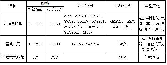 用于制造鋼制無縫氣瓶、車用CNG氣瓶、復合氣瓶。公司生產的高壓氣瓶管為管制瓶制造提供優 質的熱軋薄壁無縫鋼管,具有內外表面質量好、壁厚均勻、質量輕、生產率和成材率高、成本低等優點,便于無縫管制瓶瓶底收口的關鍵技術的應用,使氣瓶管的制 造從采用鋼坯經沖孔拉撥轉向采用薄壁無縫鋼管制造,并已成為發展趨勢,深受用戶歡迎。